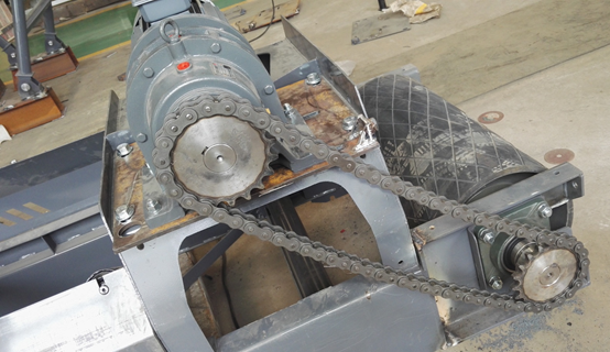 结构:电机的动力传给减速机输入轴,而减速机的动力输出轴装上链轮,传动滚筒的出轴也装上链轮,减速机通过链条把动力传给传动滚筒。