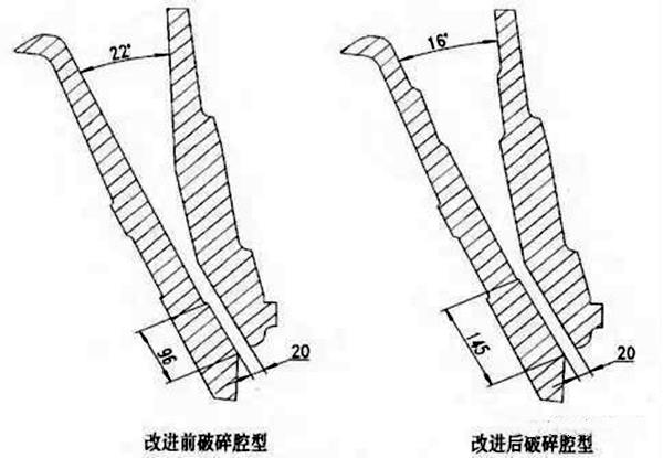 单缸液压圆锥破机在使用中分别使用了由图2所示的两种腔型,根据现场使用情况,使用改进后破碎腔不仅大大提高了产品粒度,还提高了破碎机通过量。