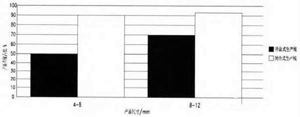 由图3可得闭合式生产线所生产的产品粒度占比远远高于开放式生产线。原因是不合格的返料多次破碎,成品形状更好,特别是细料产品更突出。